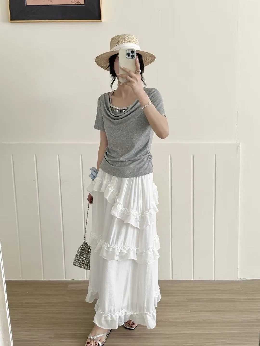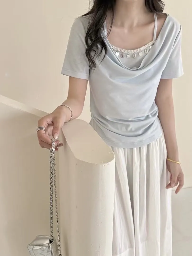 🎈貝殼裝飾假二件上衣 氣質與細節的完美融合。 輕柔面料搭配垂領設計,胸前點綴貝殼與金屬吊飾,優雅中不失精緻感。 假兩件造型提升層次感,輕鬆穿出質感造型。 🎈shiny嚴選 顏色:經典灰/氣質藍/柔和米白 尺寸:F 胸約48/肩約37/長約61