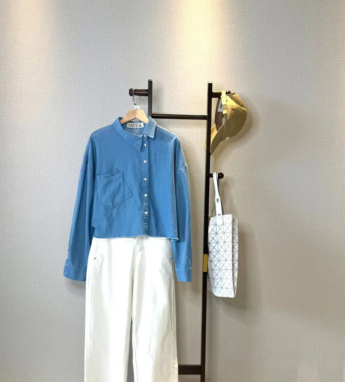 當基礎款牛仔襯衫🇰🇷 韓國新銳設計師獨家操刀,以「不規則立體褶皺包覆」設計顛覆傳統!✨ 胸前的3D立體裁片如雕塑般延伸,搭配不規則開口的鈕扣設計,側領突顯時尚造型感,一件襯衫就是一件行走的當代藝術品。