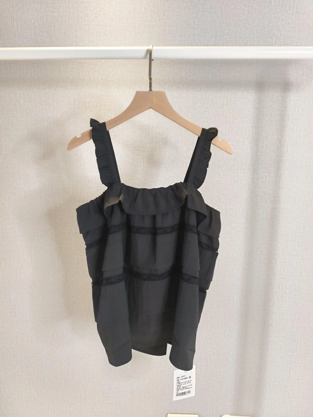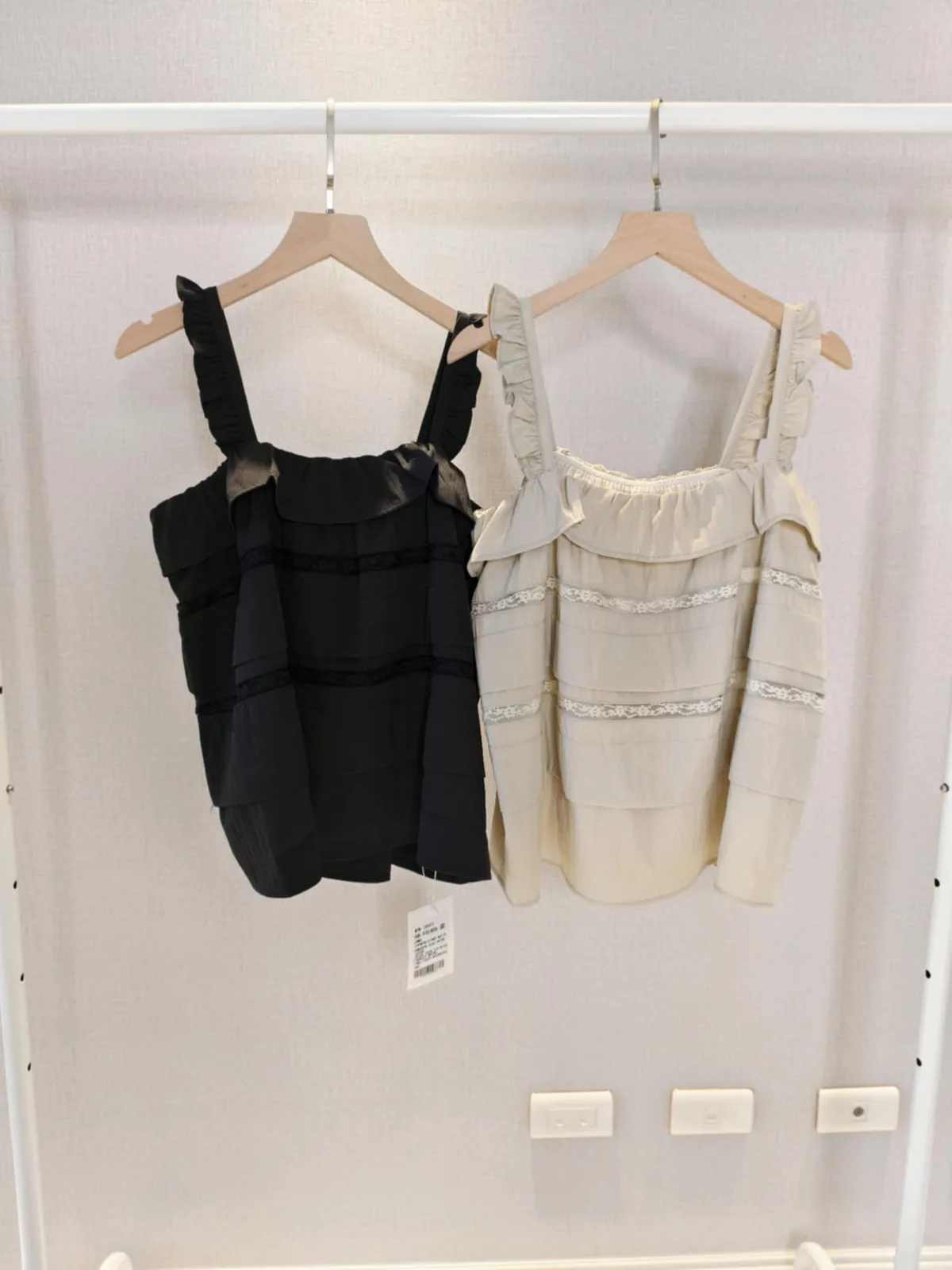 細緻的蕾絲拼接與俏皮的荷葉肩帶,輕鬆打造甜美日系感穿搭,搭配牛仔褲、短裙都超適合!💕💕